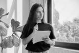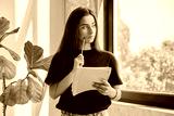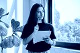 Portrait of teenage college student girl with notebook pencil at home near window