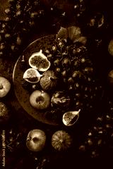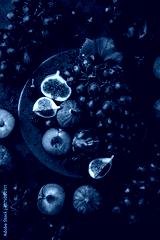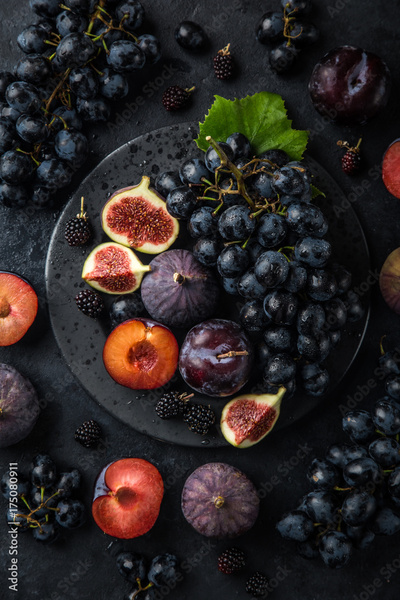 fresh dark fruits (grapes, figs, plum and blackberry) on black plate, concrete background