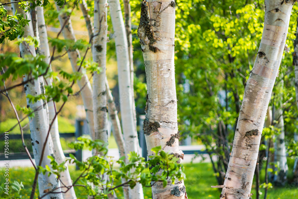 Closeup of many green birch trees grove with leaves in summer in park Quebec, Canada