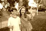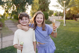 Brother and sister siblings eating ice cream and hugging in the park at sunset