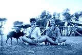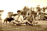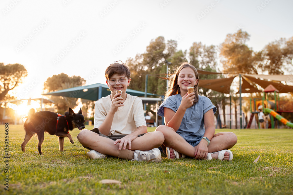 Brother and sister eating ice cream on the grass with their chihuahua in the park at the sunset
