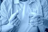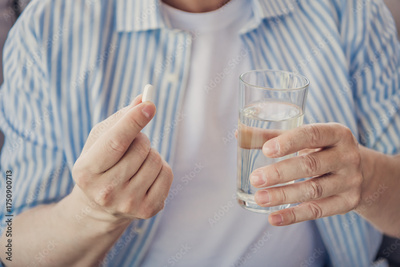 Close-up of a hand holding a white pill alongside a glass of water, a concept of healthcare and therapeutic medication.
