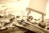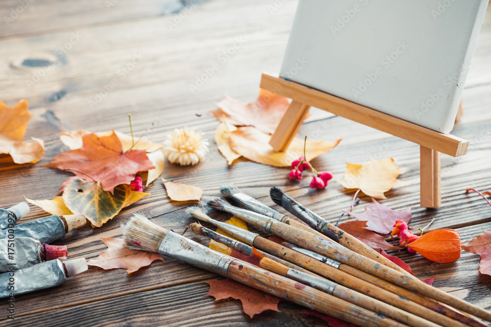 Canvas on easel, paint tubes, brushes for painting and autumn leaves on old wooden background. Retro toned.