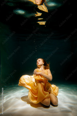 Ethereal Underwater Portrait Featuring an Enchanting Model in a Flowing Yellow Dress
