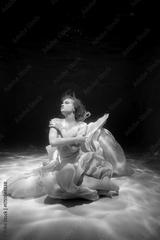 An Elegant Underwater Portrait Featuring Flowing Golden Fabric Captures Delicate Beauty and Grace