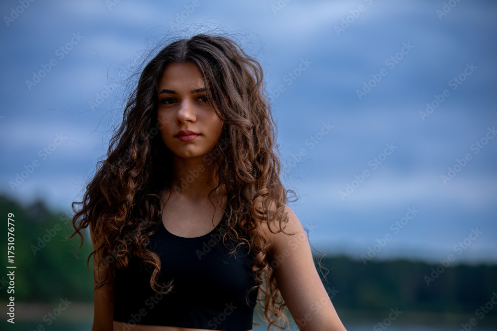 A Young Woman Poses Beautifully by Water with Her Gorgeous Curls A NatureInspired Fashion Shoot