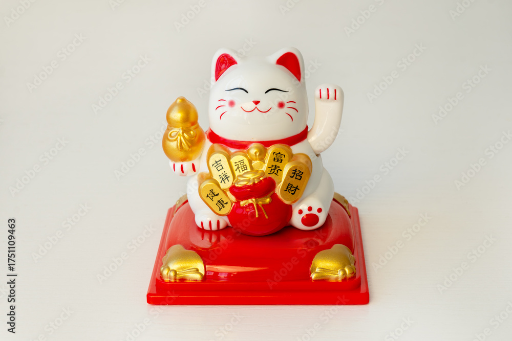 Maneki-neko. Japanese and Chinese cat of fortune and luck on a white background. The cat holds a coin on which there is written good luck wishes