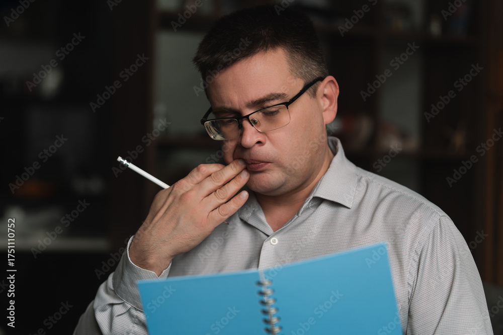 man holds a blue notebook in his hands, making notes with a pencil. The teacher, a professor with glasses, prepares the curriculum at home.