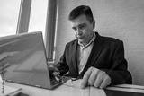 Thoughtful it developer thinking about fixing software bugs on netbook. contemplative male student watching tutorial on web site learning online via laptop computer. Focus on work. employee in office.