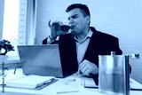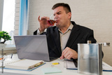 businessman drinks alcohol while sitting at a table next to a laptop in a office. Drink alcohol in the workplace. Alcoholic employee.