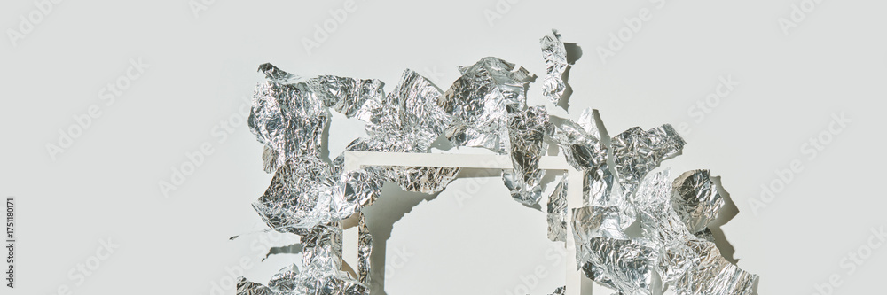 Crinkled aluminum foil art on minimalist white background with geometric frame element.