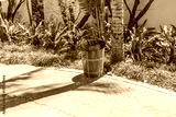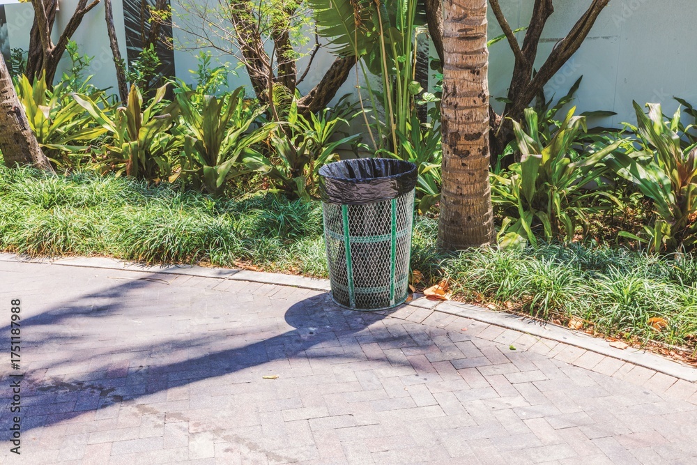 Metal trash bin with black bag near palm trees and green plants on Ocean Drive in Miami Beach. USA.