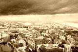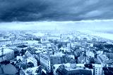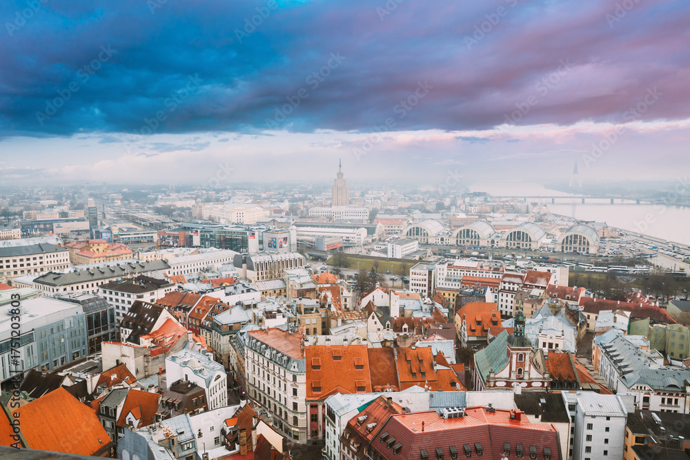 Riga, Latvia. Top View Cityscape In Misty Fog Rainy Day. Latvian Academy Of Sciences, Bus Station Riga International Coach Terminal And Riga Central Market