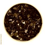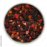 Dried strawberry, hibiscus, and rosehip tea blend in a white ceramic bowl, viewed from above, ideal for a fruity herbal infusion