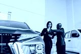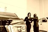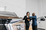 An African American man and a dealer discuss car features in a modern showroom, focusing on customer service and automotive design.
