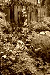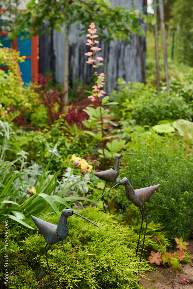 A Beautiful and Lush Garden Scene Featuring Decorative Bird Statues as the Main Focus