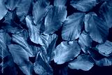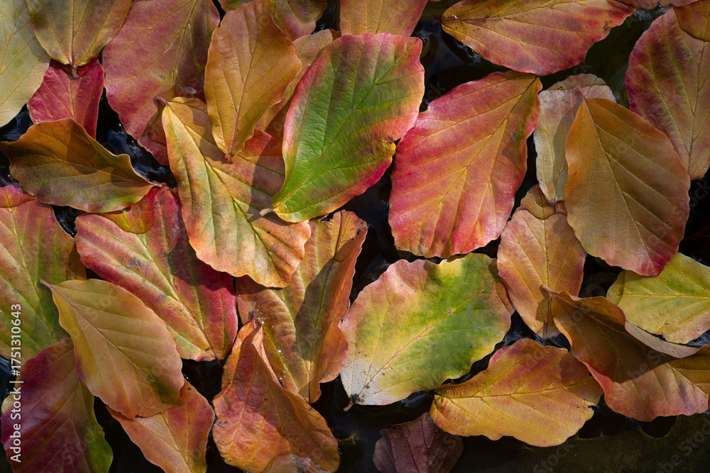 Background and close-up shot of many colorful autumn leaves floating on calm water. The leaves glow in shades of red, green, and yellow.