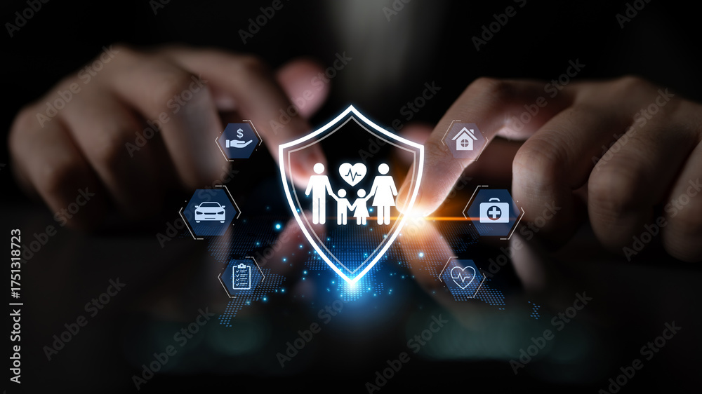 Concept of comprehensive insurance coverage and financial planning. A policy that provides life, health, and asset protection for a family's security and risk management. Fermion