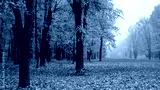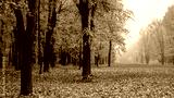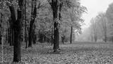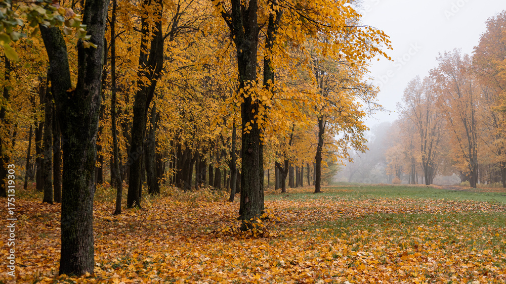 Golden autumn leaves blanket the ground in the park, creating a warm atmosphere