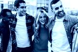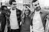Group of cheerful multiracial friends embracing while laughing at city street. Friendship, youth, and joyful lifestyle concept.
