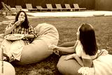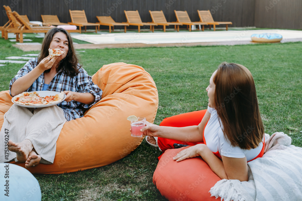 Female friends sharing pizza on colorful bean bags in a backyard grass setting, enjoying casual outdoor dining and laid-back social moment