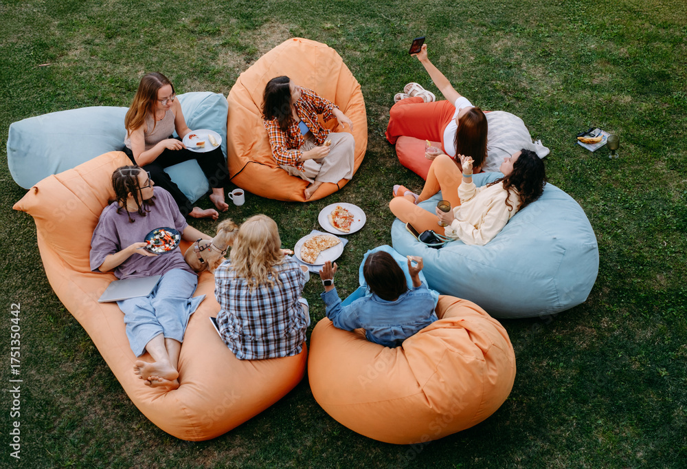 Overhead view of friends lounging on colorful bean bags in a backyard, sharing pizza, salad, coffee, and taking selfies in a relaxed summer gathering.