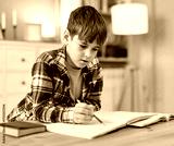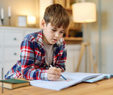 Portrait of a teenage boy doing homework at home, Concentrated beautiful male white child writing in hisnotebook. Focused caucasian schoolboy studying and preparing for exams