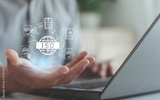 Businessman showing ISO certification hologram concept for quality management, international standards, compliance system, global business assurance, accreditation and quality control technology.