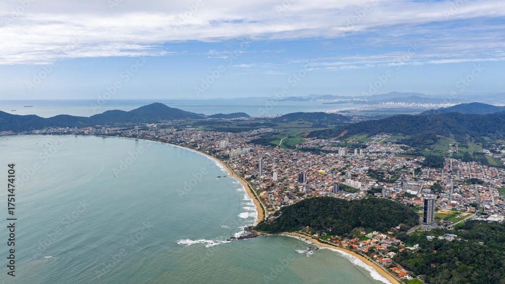 Aerial panoramic view of Penha’s coastline with beaches, hills, and urban landscape under a bright sky, Santa Catarina, Brazil.