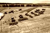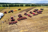 tractor working in field on bright sunny day. The concept of work in fields and agriculture industry. Plowing the land with a plow using a tractor. harvesting, tillage of soil and plants. aerial view,