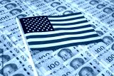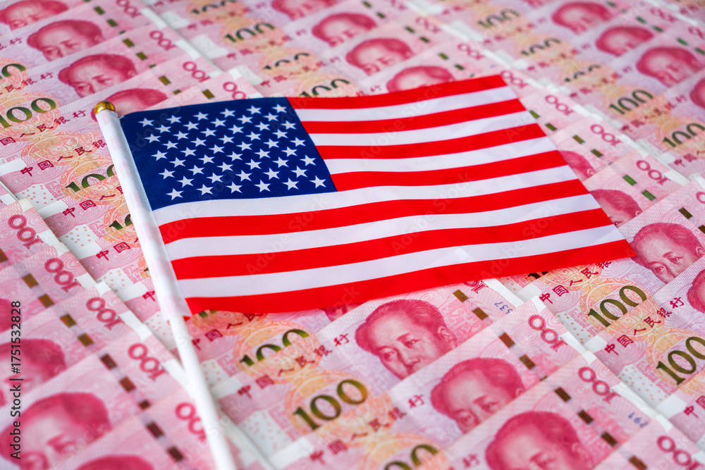 Trade tension, trade war or commercial conflict between US and China, economic concept : Chinese yuan or renminbi bill with the American flag. Depicting the trade war between the two major economies.