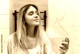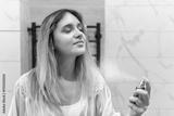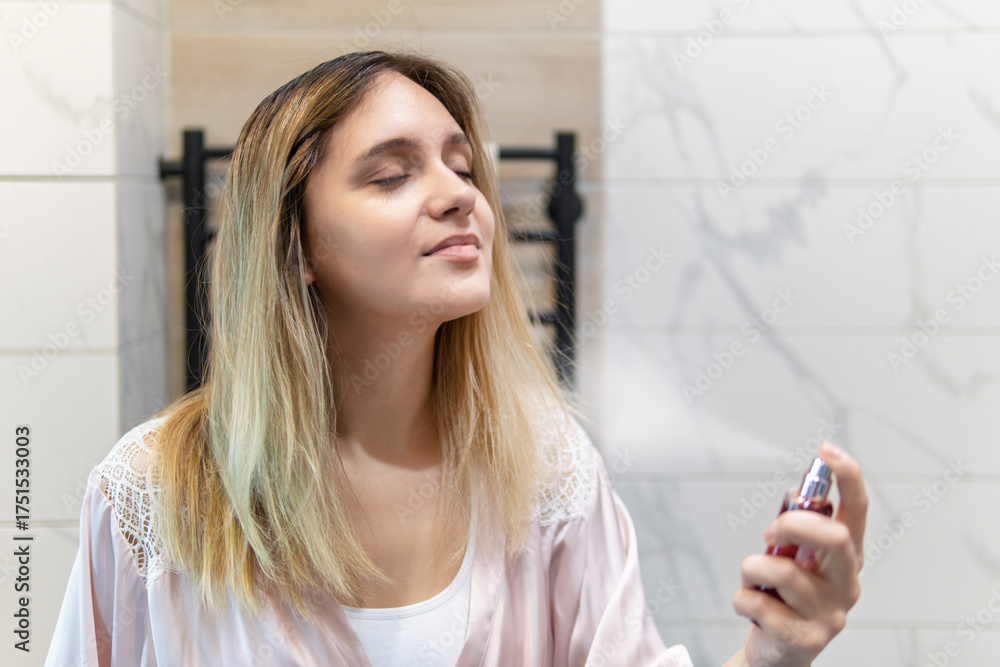 young attractive woman happy positive smile enjoy spray new fresh perfume aroma morning bathrobe indoors