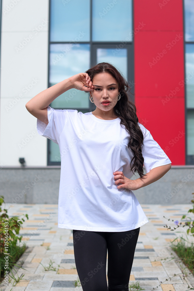 A young woman wearing a casual white tshirt enjoys her time outdoors in the park