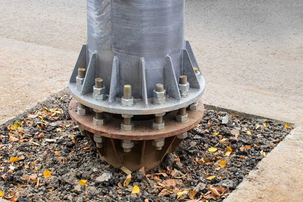 Installing a faceted conical galvanized lighting pole onto a round flange using anchor bolts and nuts.