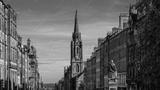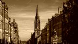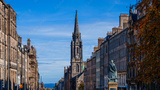 Edinburgh city street along the Royal Mile in autumn with golden foliage, tall historic buildings, and a clock tower rising into the blue sky of Scotland.