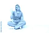 Young caucasian woman sitting on the floor isolated on white background happy and counting four with fingers
