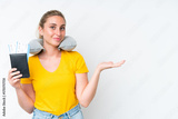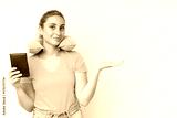 Woman with Inflatable Travel Pillow extending hands to the side for inviting to come