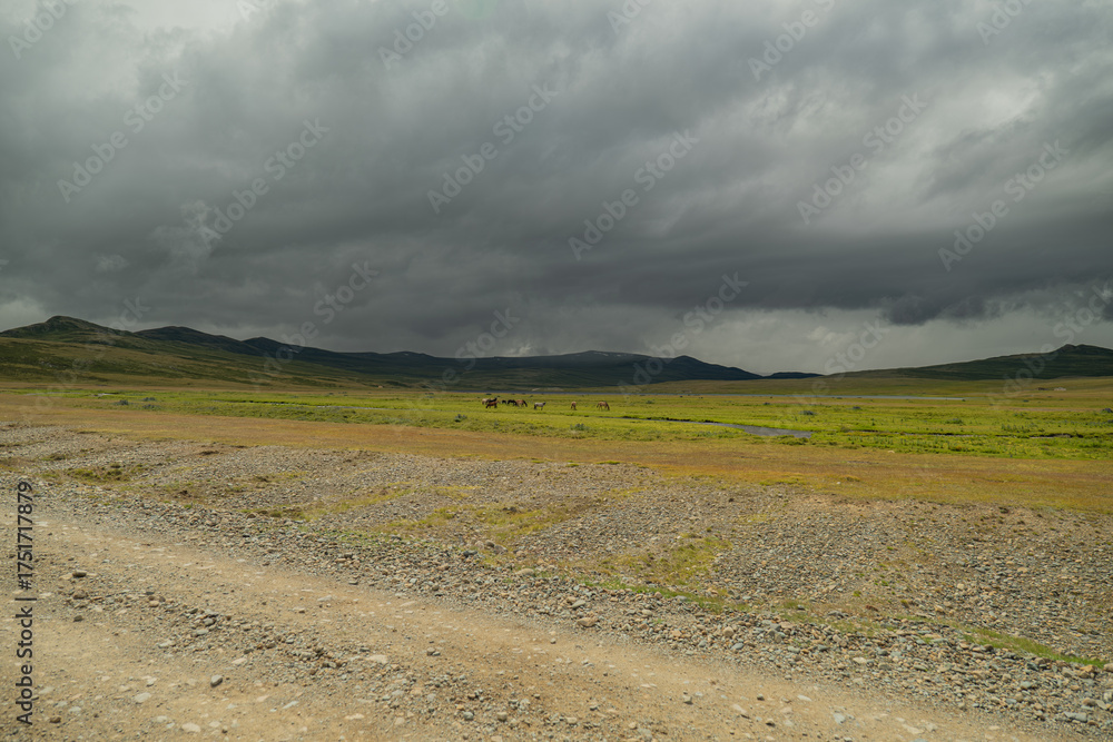 Road, green meadow and herd of horses in the distance, against the background of an approaching thunderstorm in the mountains. Pasture of horses against the background of mountains and road.