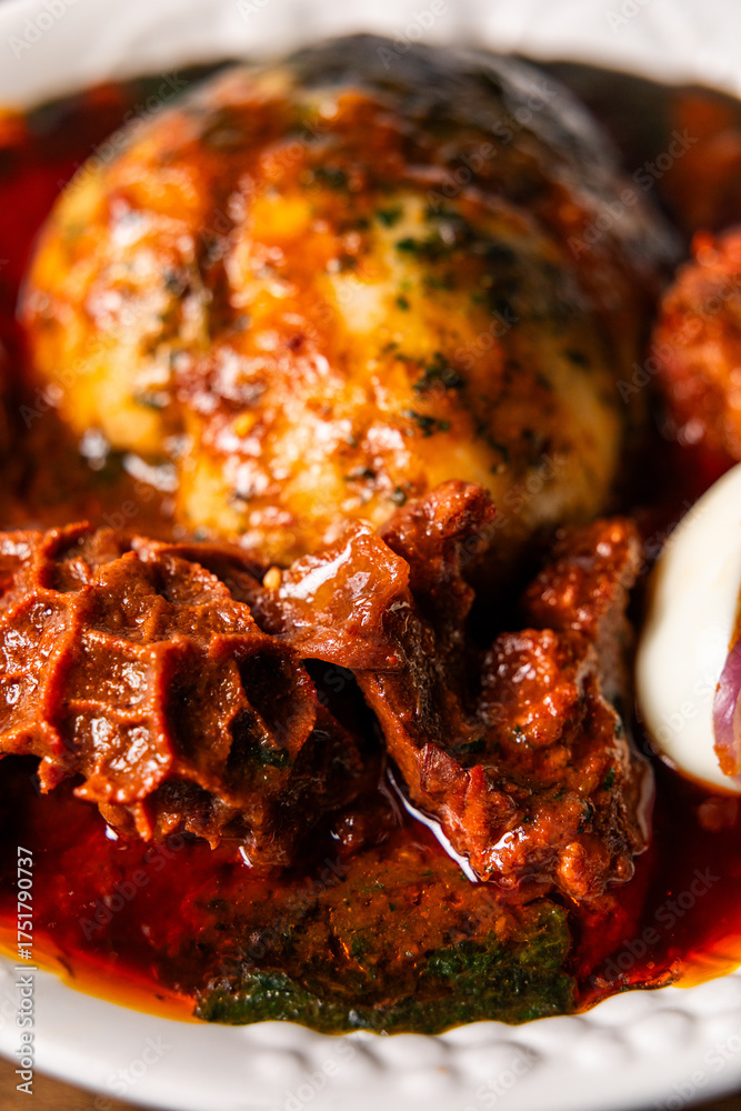 Tuo Zaafi With Green Soup, Meat, Egg, Northern Ghana staple made from corn and cassava flour, served with ayoyo jute leaf, African Dish