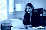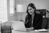 Businessman using smartphone and laptop computer in office. Happy woman, entrepreneur, small business owner working online.