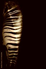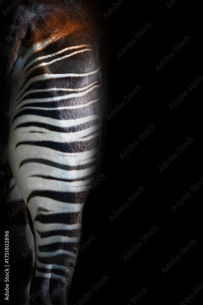 Okapi, Okapia johnstoni, also known as the forest giraffe. Rear view of the striped hind legs, isolated on a black background. An artiodactyl mammal, endemic to Democratic Republic of the Congo.