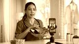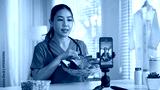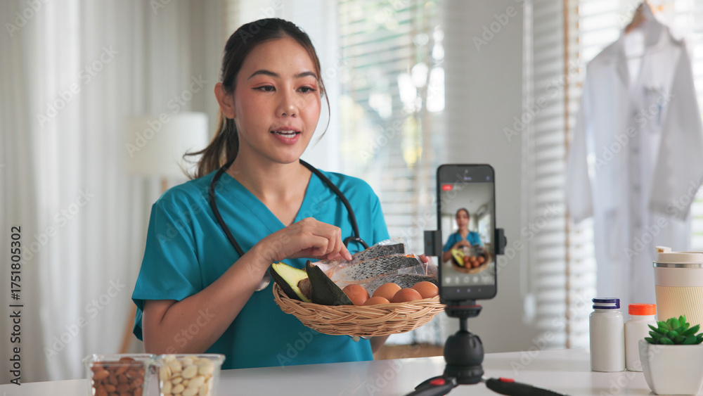 Asia woman people anti aging expert modern health care vlogger live advice talk selfie video mobile phone camera. Online diet food weight loss HDL meal plan recipe digital virtual asian coach filming.