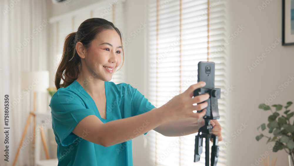 Young adult woman asia Gen Z people anti aging expert modern nurse live talk prepare video selfie camera on mobile phone app mental health care Online side hustle digital virtual asian vlogger filming