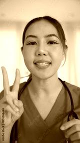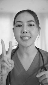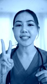 POV Young adult woman asia people anti aging expert modern nurse live talk video call selfie look at camera mobile phone app mental health care Online side hustle digital virtual asian vlogger filming