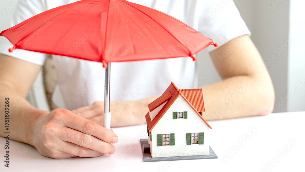 Insurance agent with red umbrella over house. Real estate insurance and security concept
