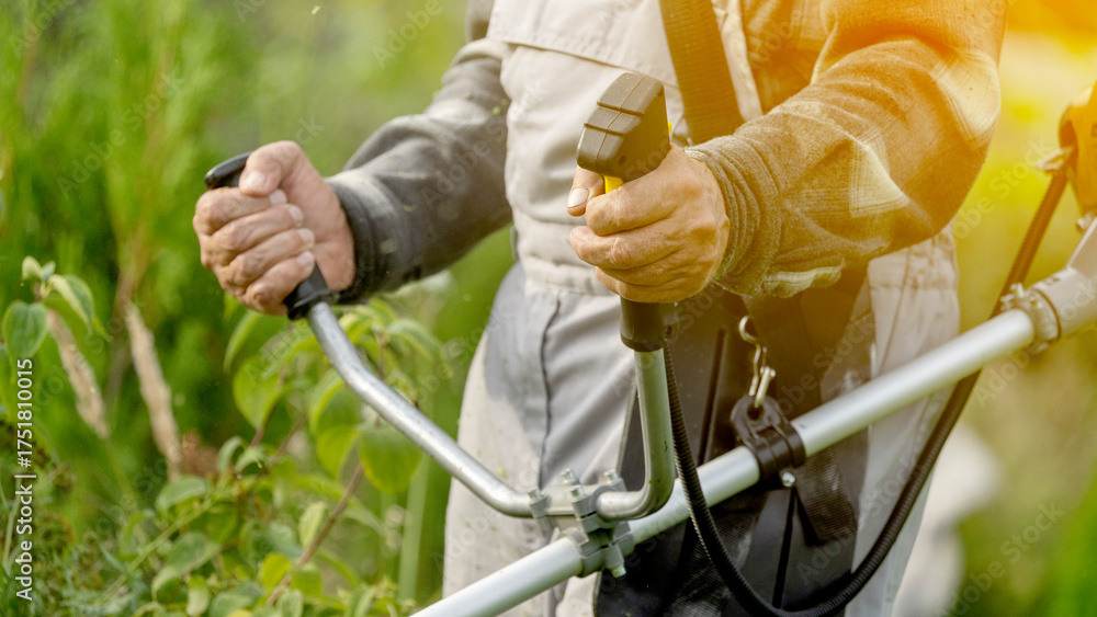 Gardener with trimmer mowing lawn