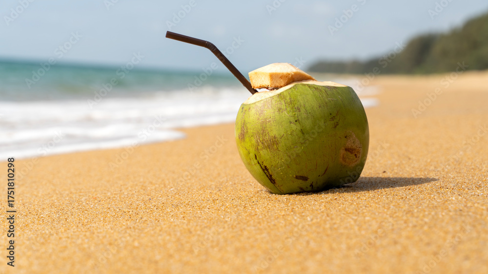 Ripe coconut cocktail on the beach by the sea