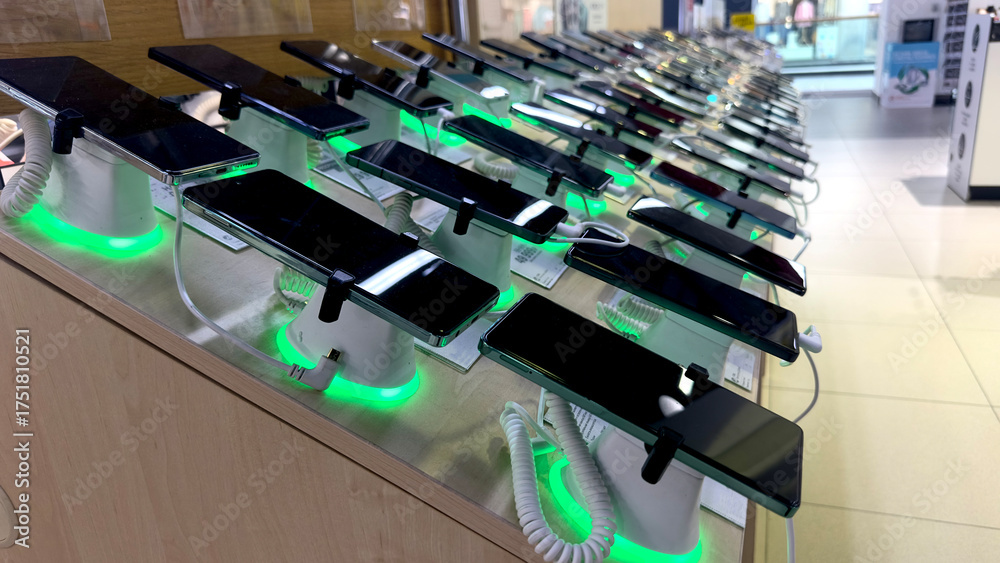 Smartphones on the counter in an electronics supermarket