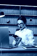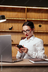 Businesswoman using smartphone while working on laptop for messaging and mobile app tasks