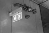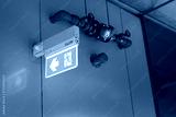 Fire escape route exit sign, lighting banner is glowing in green light that installed at building interior. Transportation sign object.